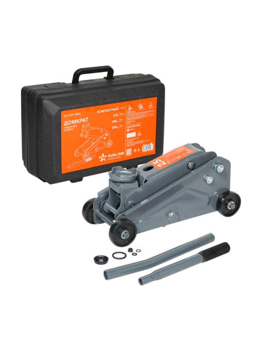 Подкатной домкрат AIRLINE 2.5т компактный в кейсе 367 мм 165 мм 165 мм, MIN - 145 мм, MAX - 395 мм AJ-2.3F-380L
