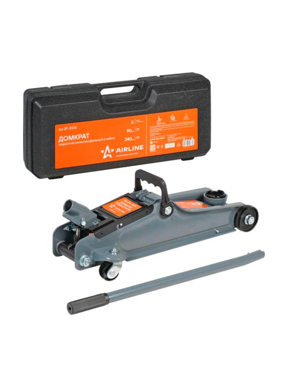 Подкатной домкрат AIRLINE 2т низкопрофильный в кейсе, MIN - 90 мм, MAX - 340 мм AJ-2F-310K