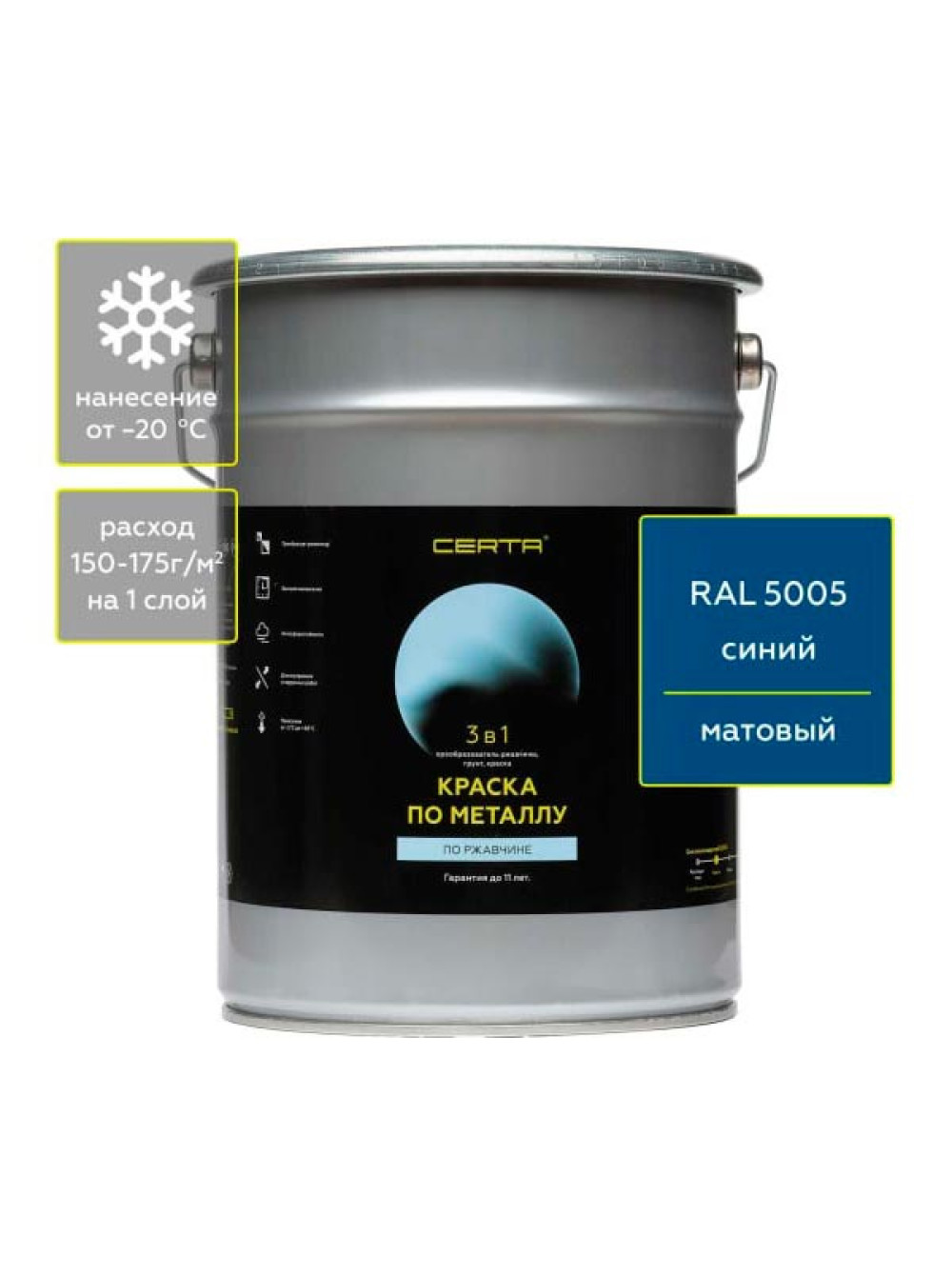 Быстросохнущая краска 3 в 1 по металлу, ржавчине Certa матовое покрытие, гладкая, синий RAL 5005 4 кг KRGL0072