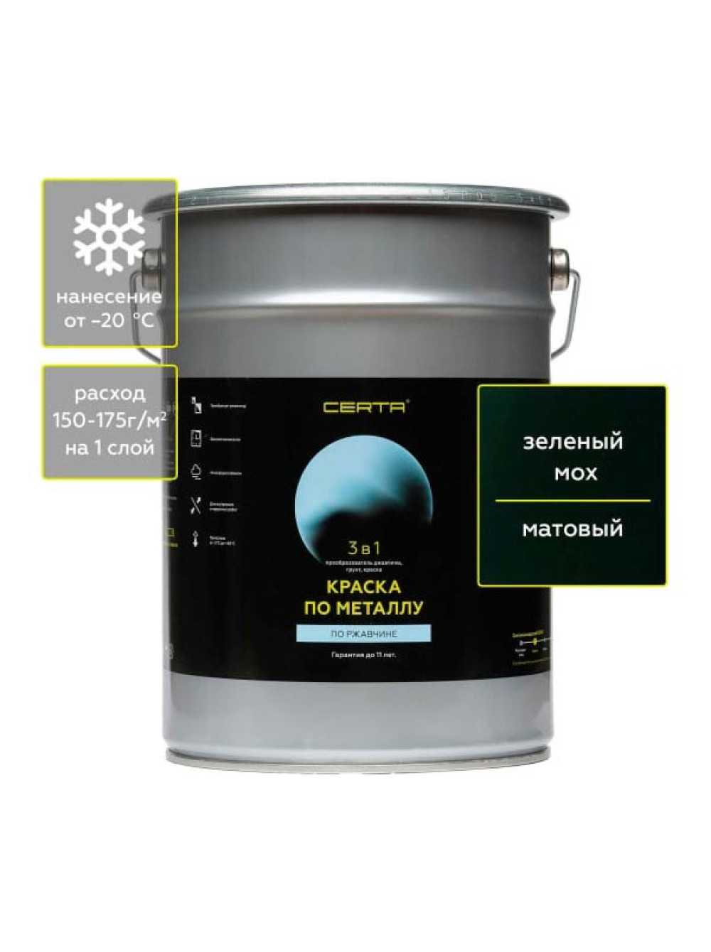 Быстросохнущая краска 3 в 1 по металлу, ржавчине Certa матовое покрытие, гладкая, зеленый мох 4 кг KRGL0036
