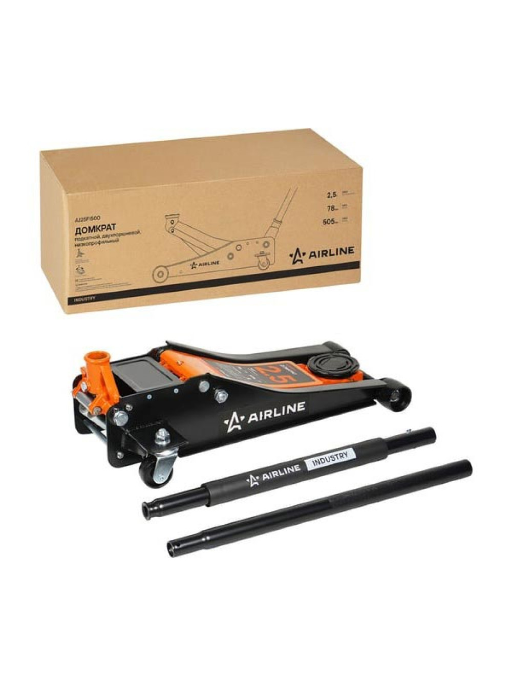 Домкрат подкатной Airline 2.5т INDUSTRY двухпоршневой низкопрофильный (MIN - 78 мм, MAX - 505 мм) AJ25FI500