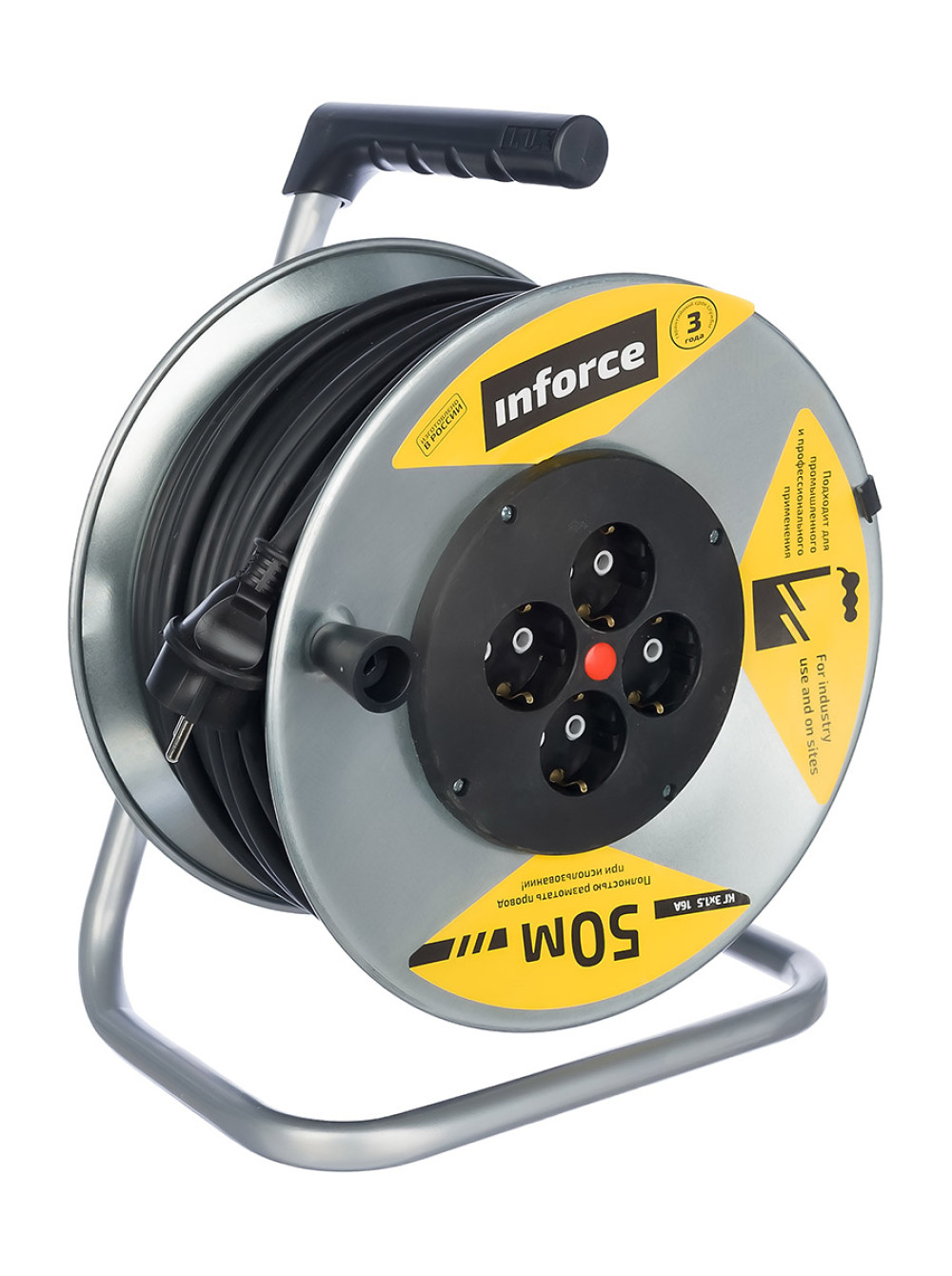 - Барабан силового удлинителя на металлической катушке Inforce К4-Е-50 50 м 4 розетки с з/к 44150 изготовлен из металла;