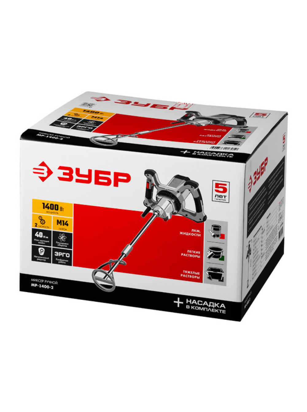 Ручной электрический миксер ЗУБР МАСТЕР МР-1400-2 прост и надежен в эксплуатации. Используется для перемешивания различных строительных составов: бетона, штукатурки, плиточных и обойных клеев, дисперсных красок и др.