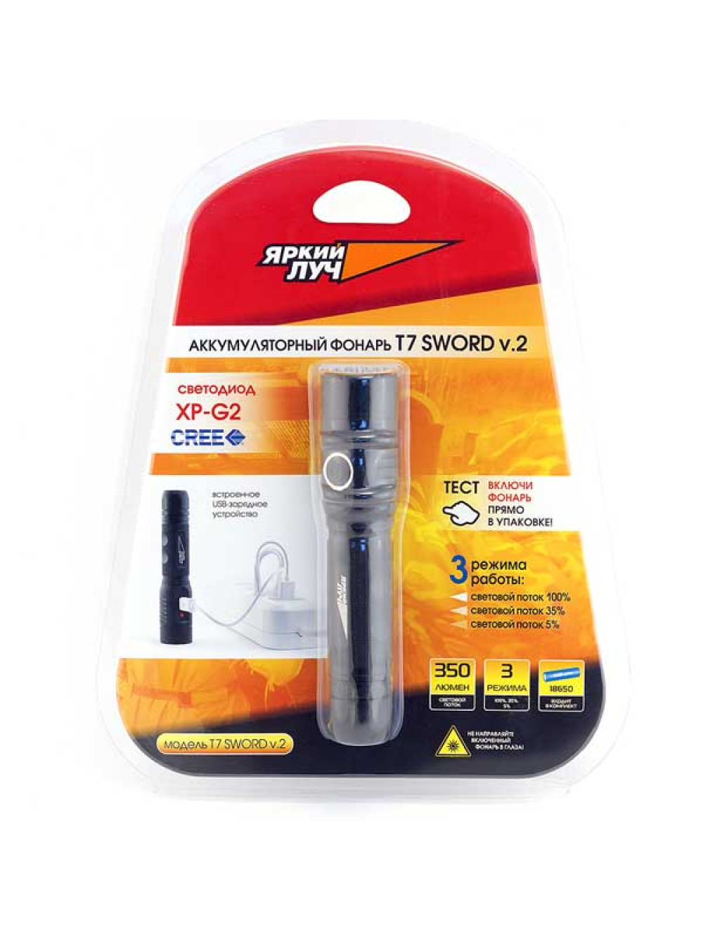 Фонарь ЯРКИЙ ЛУЧ T7v.2 CREE XP-G2 350лм 3 реж. 100/35/5%, Li-Ion 18650 2600mAh, встр. ЗУ micro-USB 4606400105794 имеет мощный светодиод, который экономично потребляет заряд литиевого аккумулятора SAMSUNG 18650. При длине корпуса всего 14 см фонарь идеально располагается в ладони. Данная модель прекрасно подходит для использования в хозяйстве, путешествиях, при вечерних прогулках и пр.