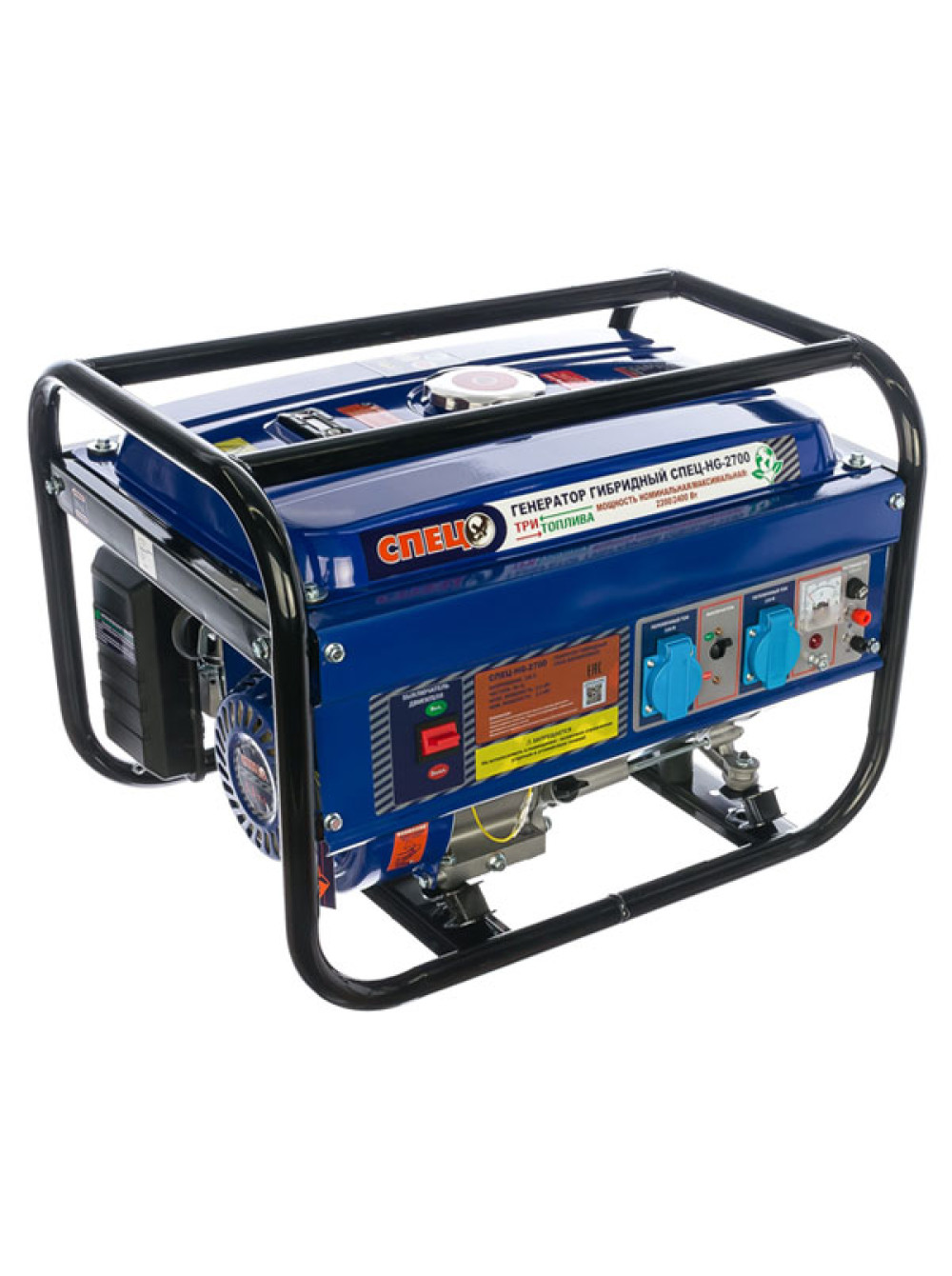 Гибридный генератор газ-бензин СПЕЦ-HG-2700 и комплект для подключения к сети+баллону предназначается для снабжения бытовых приборов или инструментов электричеством на даче, в домашней мастерской. Все элементы устройства крепятся на жесткую металлическую раму, которая образует две ручки для удобства перемещения по площадке. Предусматривается масляный щуп, с помощью которого пользователь имеет возможность контролировать уровень смазочной смеси в картере.