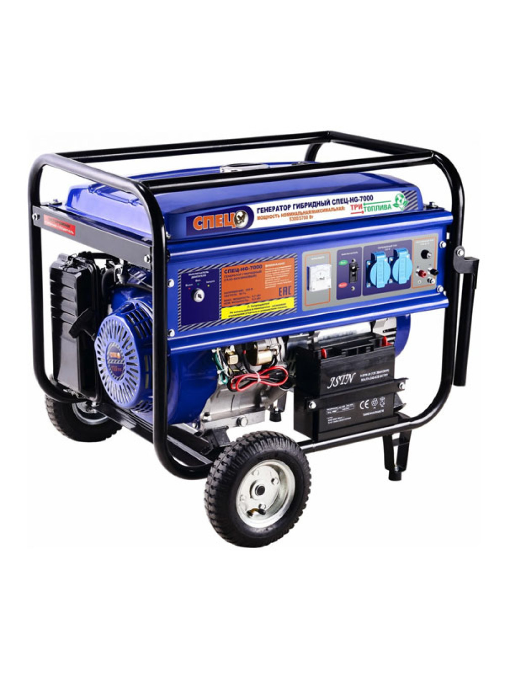 Гибридный генератор газ-бензин СПЕЦ-HG-7000 и комплект для подключения к сети+баллону предназначается для снабжения бытовых приборов или инструментов электричеством на даче, в домашней мастерской. Все элементы устройства крепятся на жесткую металлическую раму, которая образует две ручки для удобства транспортировки. В комплект поставки входят колеса для простоты перемещения по ровной рабочей площадке. Двигатель агрегата запускается про помощи ручного или электростартера.