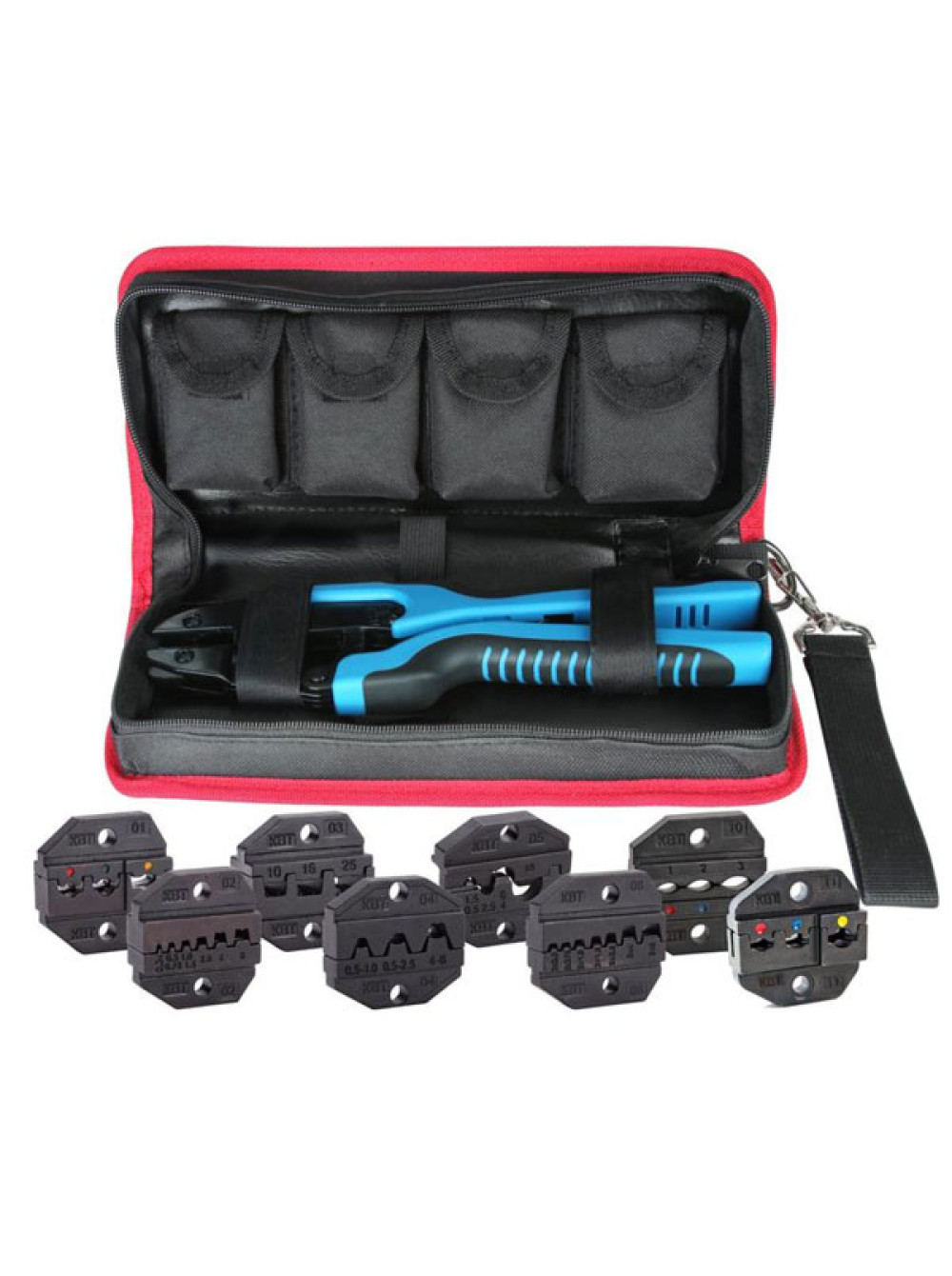 Кримпер для опрессовки наконечников с набором из восьми матриц в тканевой сумке. Опрессовка изолированных и неизолированных наконечников, изолированных и неизолированных гильз и разъемов, втулочных наконечников.