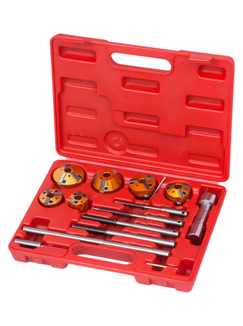 Набор фрез для правки сёдел клапанов 14 предметов МАСТАК 103-13014C. Предназначен для правки методом зенковки сёдел клапанов в двигателе внутреннего сгорания. Устройство позволяет добиться идеального прилегания клапана к седлу, что существенно влияет на характеристики двигателя, Увеличивает его ресурс и положительно сказывается на экономичности. Применяются в чатсности для а/м: ВАЗб малолитражных иномарок, Волга,, УАЗ, ГАЗ, ЗИЛ, среднетонажных грузовиков, МАЗ, КАМАЗ, Икарус, MAN, большегрузных грузовиков, тракторов. Инструмент расположен в пластиковом кейсе для комфортного хранения и транспортировки. 6 двусторонних фрез разного диаметра с различными углами наклона режущих элементов. 5 направляющих разного диаметра под соответствующие модели двигателей. В качестве режущих элементов установлены пластины из твёрдого сплава. Возможность регулировки и замены режущих пластин. В комплект входит: Фрезы – 6 шт Ø 28 - 35 мм 75° х 60° Ø 37 - 44 мм 75° х 30 Ø 37 - 46 мм 68° х 45 Ø 44 - 52 мм 75° х 30° Ø 46 - 60 мм 45° х 30° Ø 52 - 65 мм 75° х 60° Направляющие втулки – 5 шт Ø 5,5 мм Ø 7 х 8,8 мм Ø 8 х 9,8 мм Ø 9 х 10,8 мм Ø 10 х 11,8 мм Держатель фрезы – 1 шт Вороток – 1 шт Ключ Г-образный TORX для регулировки режущих элементов – 1 шт