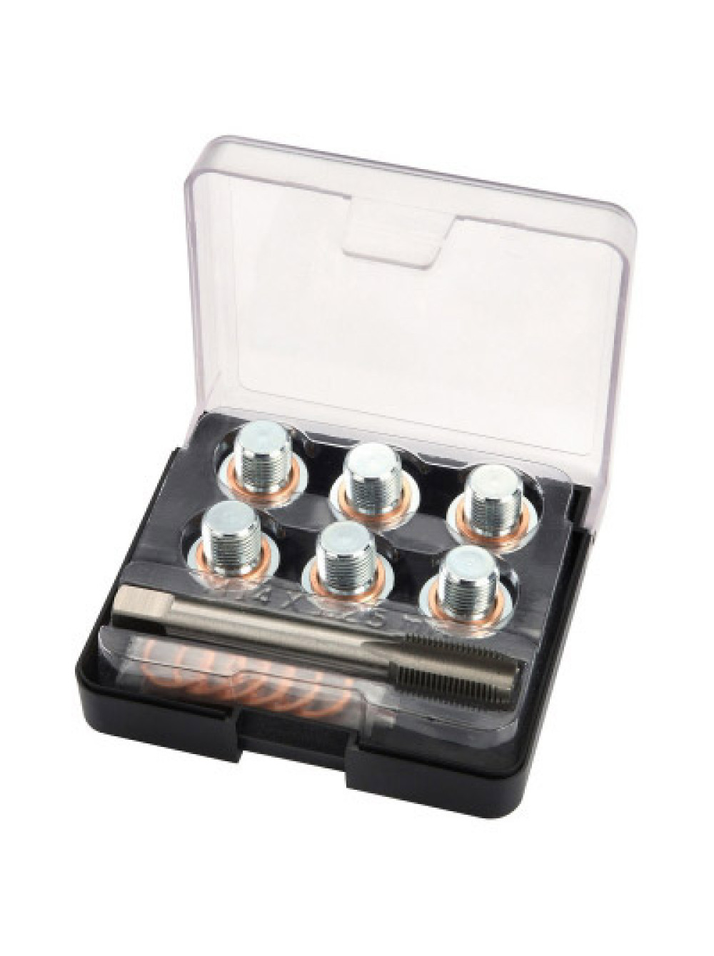 Набор для ремонта масляных пробок М14х1,25, 19 предметов МАСТАК 103-47014С. Предназначен для ремонта или восстановления маслосливного отверстия в картере двигателя автомобиля. Инструмент расположен в пластиковом боксе для комфортного хранения и транспортировки. В комплект входит: Метчик М14х1,25, материал SKS3 – 1 шт Пробки для слива масла, материал 1015 – 6 шт Шайбы медные – 12 шт