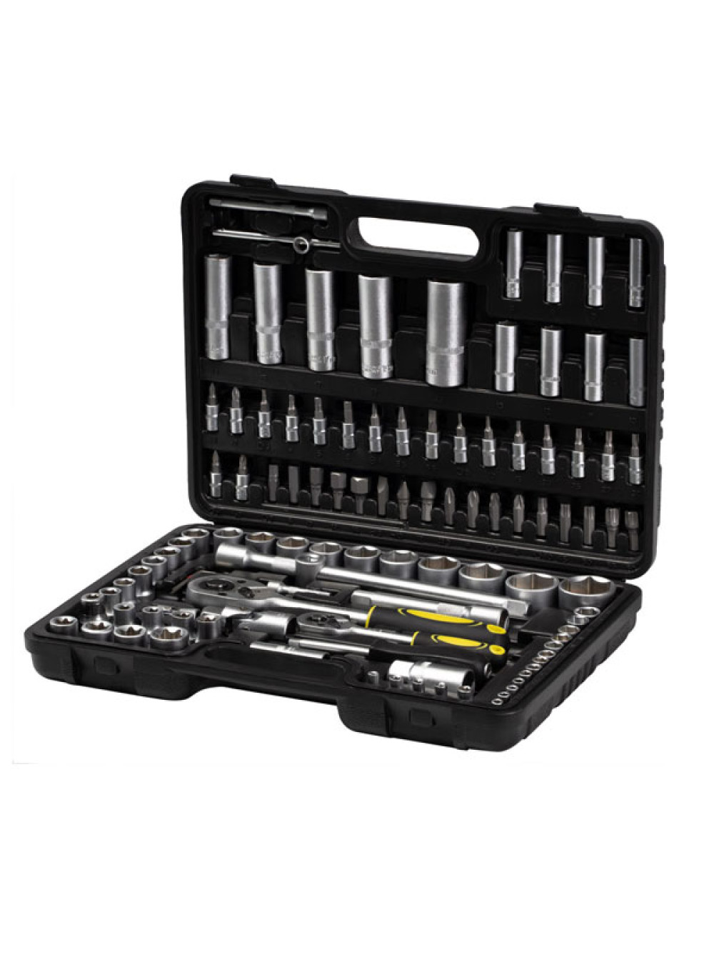 В кейсе предусматривается специальное место для каждого элемента набора, что позволяет переносить инструмент и оснастку без смешивания в процессе транспортировки. Защелки исключают случайное открытие кейса.