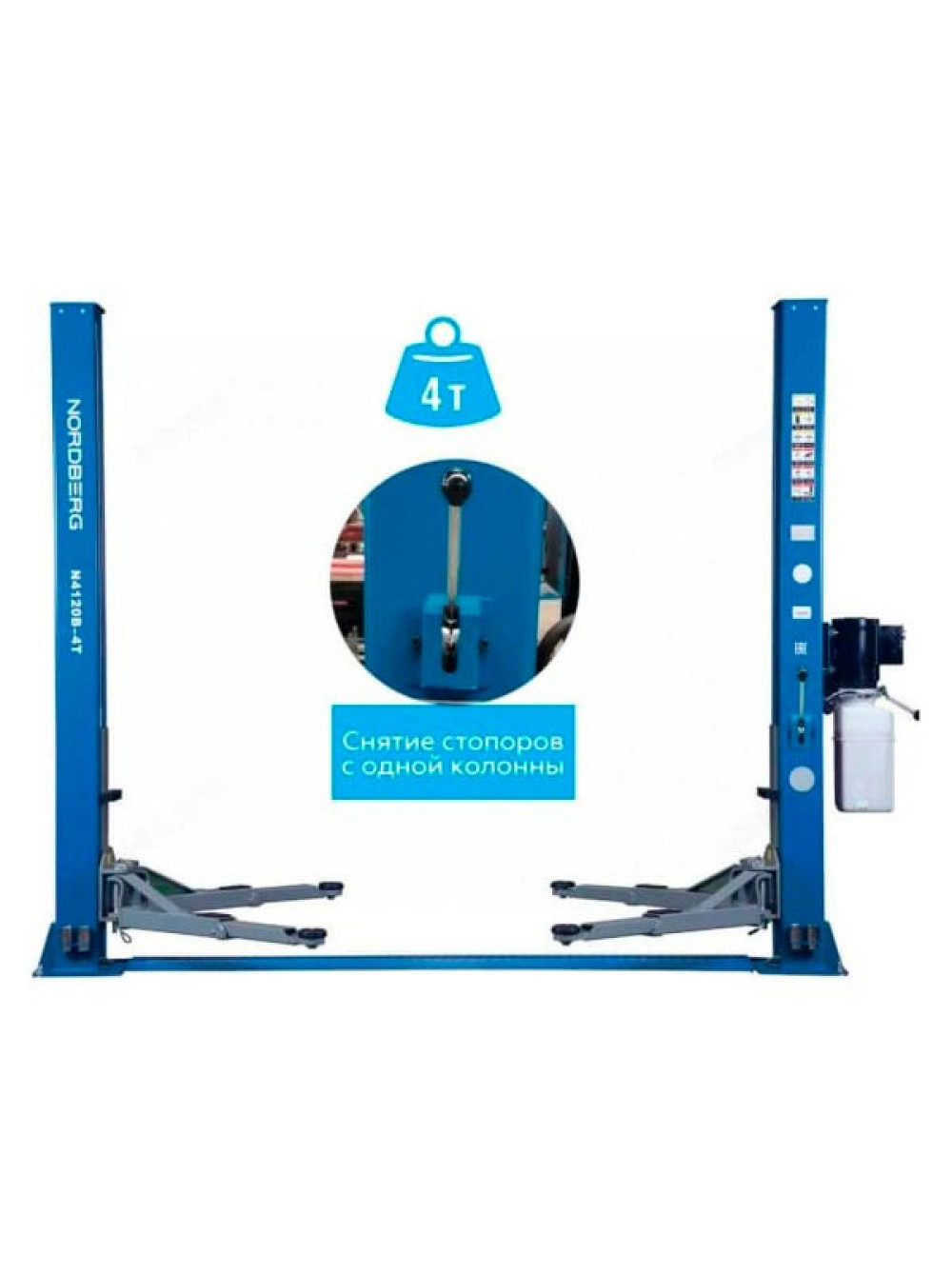 Подъемник NORDBERG 2-стоечный 4 т, снятие со стопоров с одной колонны, 380 В, синий N4120BM-4B_380