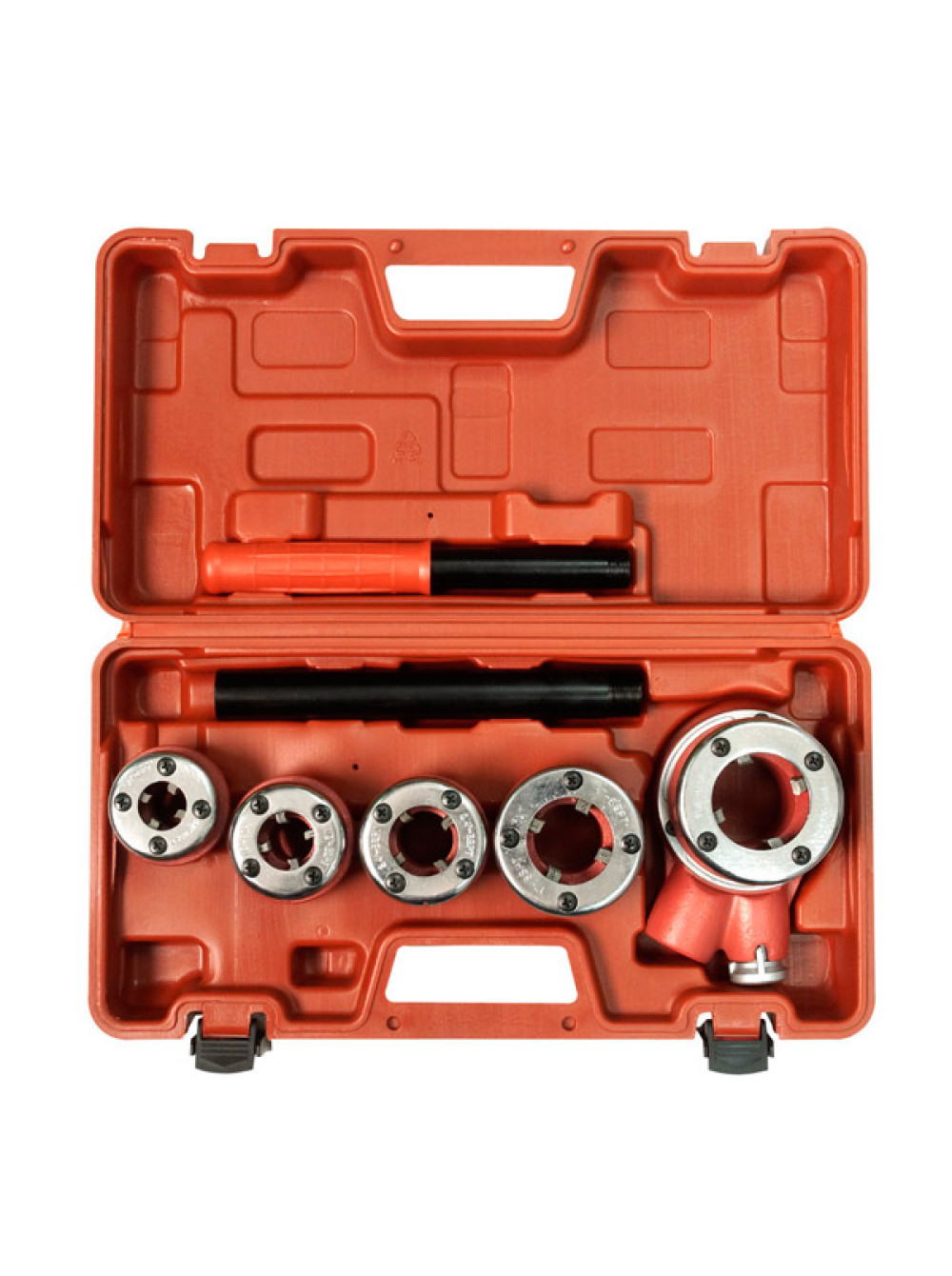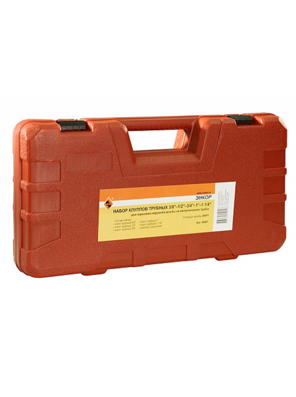 Набор трубных клуппов с адаптером (3/8-1/2-3/4-1- 1 1/4) Энкор 48481 - комплект специализированных приспособлений для нарезания наружной конической резьбы. Пластиковый кейс с ложементами обеспечивает удобство хранения и транспортировки.