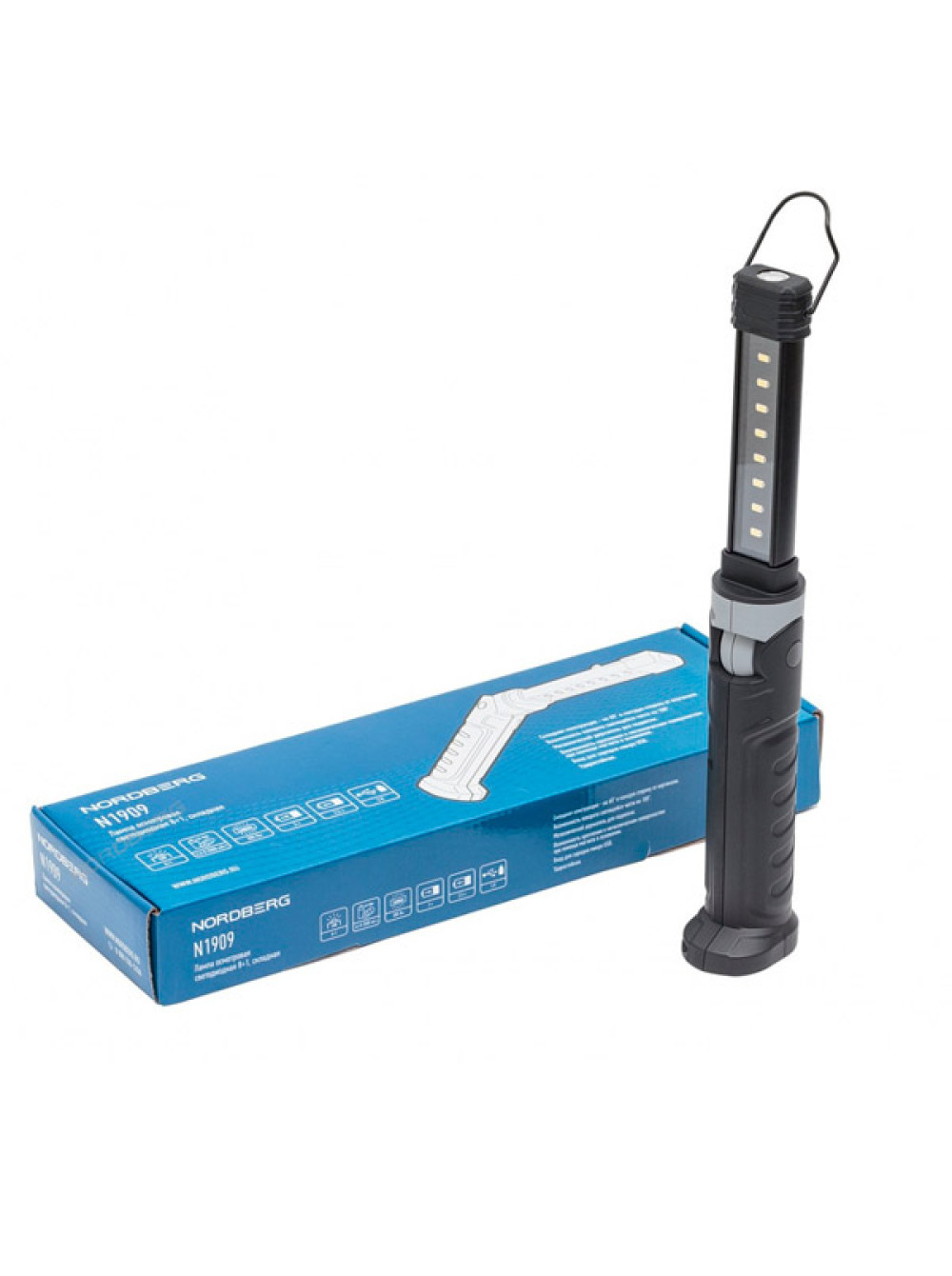 Светодиодная складная аккумуляторная лампа NORDBERG 8+1 1909 используется в области ремонтных работ и технического обслуживания автомобилей. Подходит для применения в частном гараже, на даче, в подсобном помещении и т. д. Изделие оснащено металлическим держателем для возможности подвеса. Также может фиксироваться на металлических поверхностях благодаря встроенному магниту