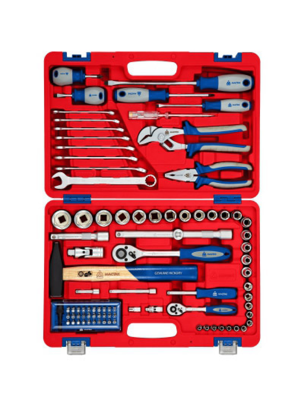 Универсальный набор инструментов МАСТАК 01-088C 88 предметов - это многофункциональный комплект, который предназначен для монтажа и демонтажа резьбовых соединений, проведения ремонта и обслуживания автомобилей, садовой и бытовой техники. Рабочие части инструментов выполнены методом горячей ковки из инструментальной легированной хром-ванадиевой стали, что предает инструменту прочность и износостойкость. Рукоятками изготовлены из бензомаслостойкой резины для комфортной работы. Прочный и компактный кейс с металлическими защелками увеличивает срок службы набора, а также делает транспортировку и хранение инструмента более комфортной. Комплектация Головки и принадлежности 1/2" Головки торцевые стандартные 6-гранные 8, 9, 10, 11, 12, 13, 14, 15, 17, 18, 19, 21, 22, 24, 27, 30, 32 мм Удлинители стандартные 125, 250 мм Трещотка флажковая с кнопкой 45 зубцов, длина 250 мм Кардан 1 шт. Переходник с отверстием для воротка 3/8" х 1/2" Головки и принадлежности 1/4" Головки торцевые стандартные 6-гранные 4, 4.5, 5, 5.5, 6, 7, 8, 9, 10, 11, 12, 13 мм Удлинители стандартные 50, 100 мм Трещотка флажковая с кнопкой 45 зубцов, длина 125 мм Кардан 1 шт. Переходник адаптер для вставок (бит) F1/4 > F1/4" Отвертка-вороток 150 мм Вставки (биты) 1/4" (6.35 мм) Набор вставок с держателем для дрели 31 предмет Ключи Ключи комбинированные 10, 11, 12, 13, 14, 15, 17, 19 мм Отвёртки Крестовые Phillips №2 х 100 мм, №2 х 38 мм Шлицевые Slotted 5.5 х 100 мм, 6.5 х 38 мм, 8.0 х 200 мм Шарнирно-губцевый инструмент Плоскогубцы комбинированные длина 175 мм Захват переставной длина 250 мм Прочий инструмент Молоток 500 гр Индикатор напряжения 6-24 В